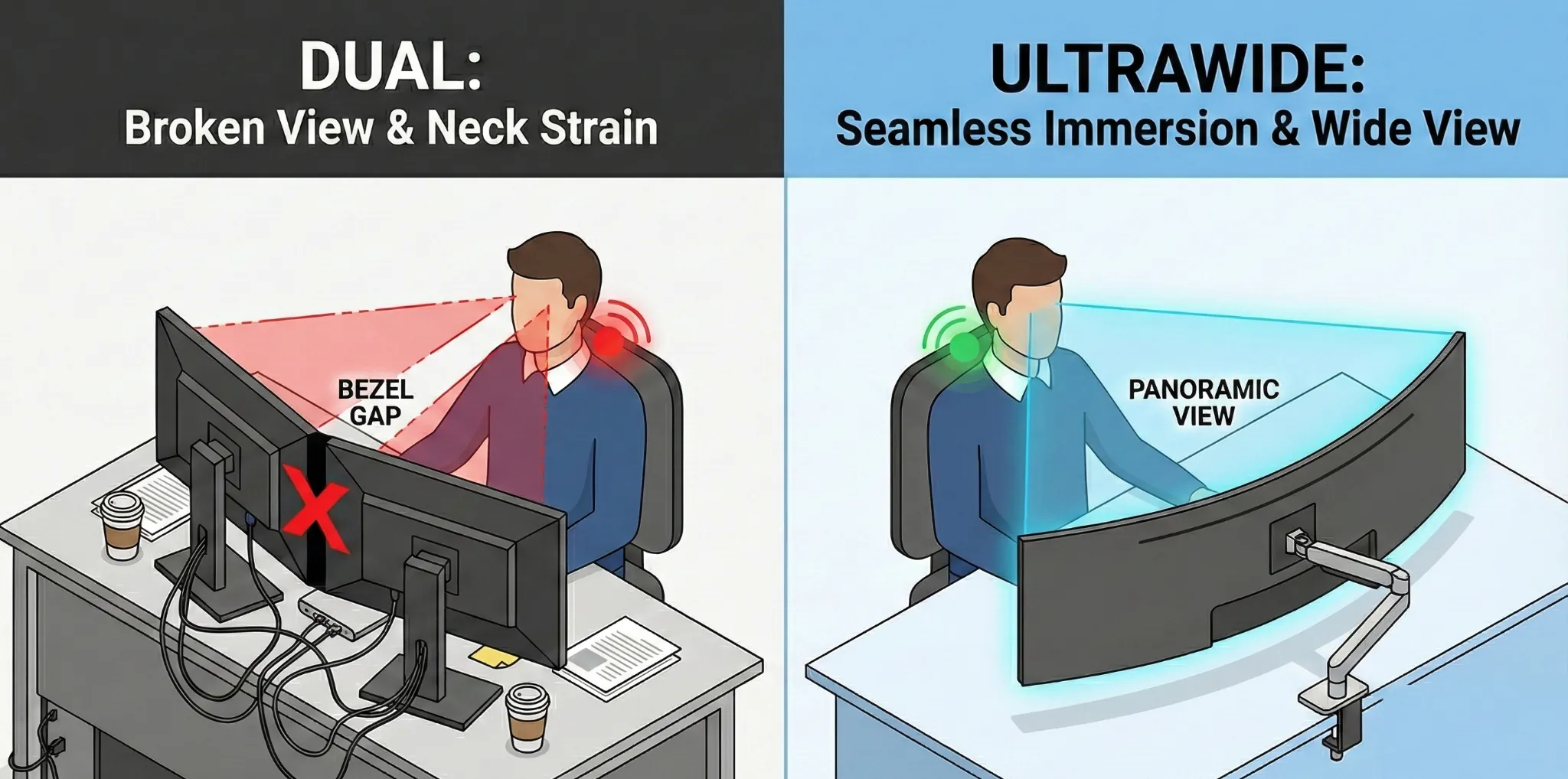 듀얼 모니터를 쓸 때 저를 괴롭혔던 가장 큰 문제는 만성적인 승모근 통증이었습니다. 원인은 명확했습니다.